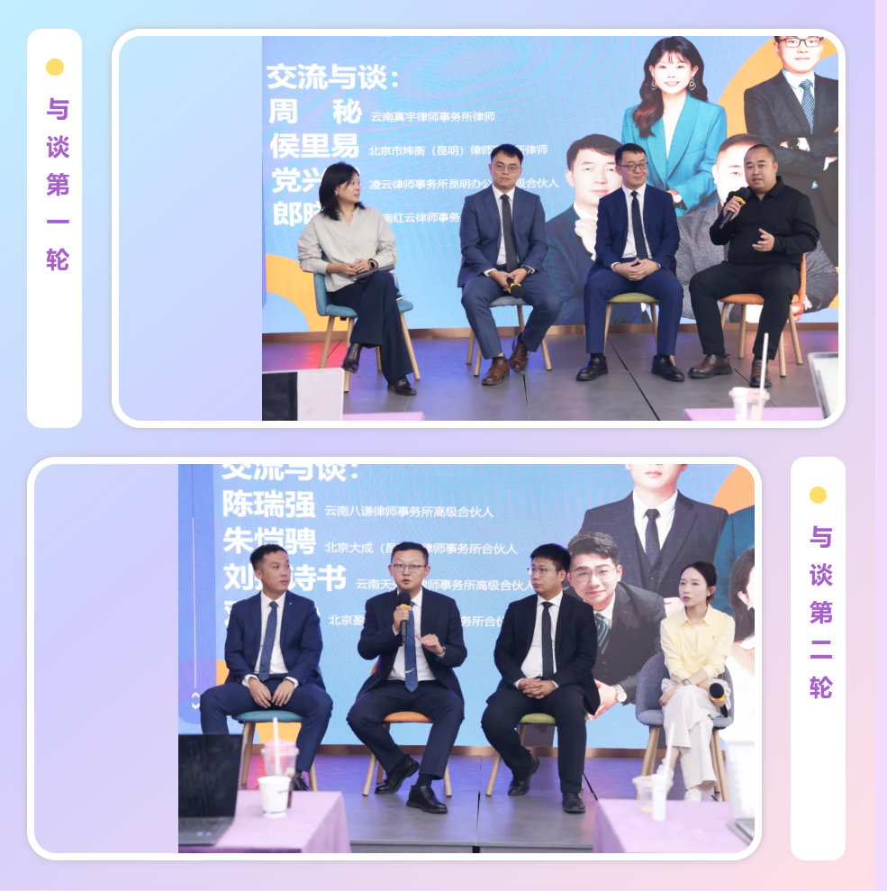 两轮“交流与谈”环节中,云南红云律师事务所郎晓冬、云南真宇律师事务所周秘、北京市炜衡(昆明)律师事务所侯里易、云南八谦律师事务所陈瑞强、北京盈科(昆明)律师事务所邓静、云南天外天律师事务所刘扬诗书等多位资深律师结合真实案例,围绕分享主题,展开了精彩纷呈的互动与探讨。他们的发言既有策略层面的思考,也有具体问题的解决方案,引发了在场青年律师的强烈共鸣,台上台下互动频繁,将现场思维碰撞的氛围推向高潮。