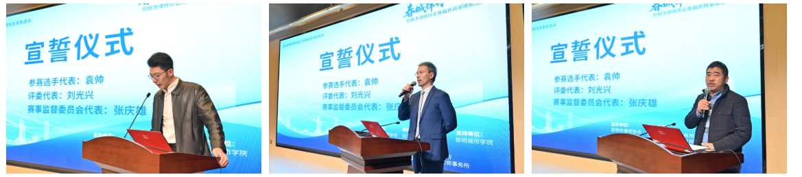 参赛选手代表袁帅、评委代表刘光兴、赛事监督委员会代表张庆雄,进行宣誓仪式。